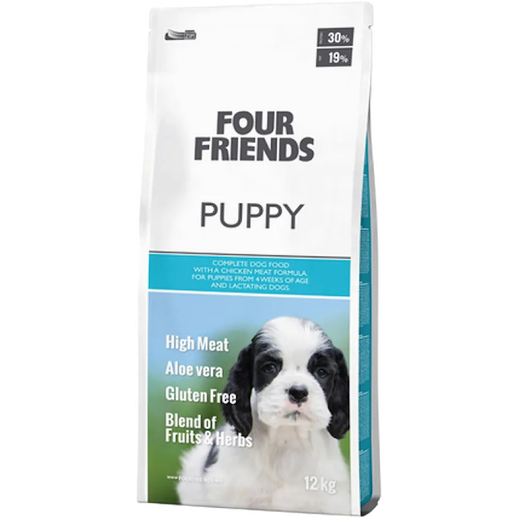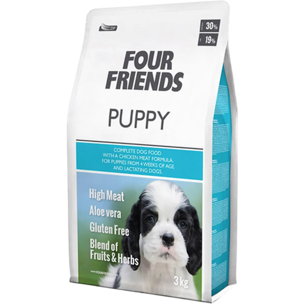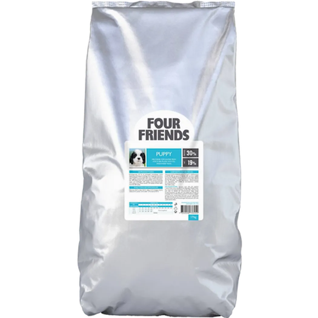 Valpmat med alla näringsämnen i perfekt balans för en normal tillväxt & utveckling av hundvalpen. Four Friends Puppy har ett höggt köttinnehåll för rätt utveckling av bland annat valpens muskler. Laxoljan bidrar med nyttiga omegafettsyror till växande valpar. Four Friends Dog Puppy