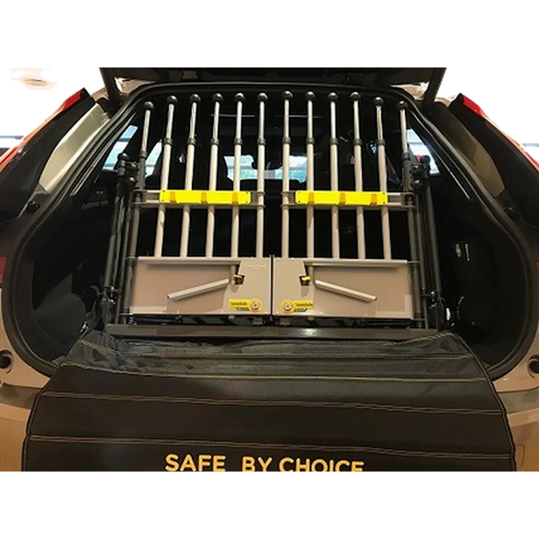 Delbar bilgrind med två dörrar för stora hundar i bilens bagageutrymme - Ställbar dubblelgrind för en eller flera hundar för att nyttja hela bagageutrymmet - Svensk krocktestad dubbelbilgrind för hundar som räddar liv i trafiken! Bilgrinden skyddar vid kollision & är helt anpassningsbar. MimSafe passar de flesta kombibilar utan tröskel & monteras utan att göra åverkan på bilen. Spänns fast med spännband i bilens lastöglor.Ska användas tillsammans med säkerhetsnät eller lastgaller över baksätets ryggstöd. VarioGate dubbelgrind är den bästa lösningen då du kan utnyttja hela bagageutrymmet. MimSafe Variogate Double hundgrind med dubbeldörrar för bakluckan.