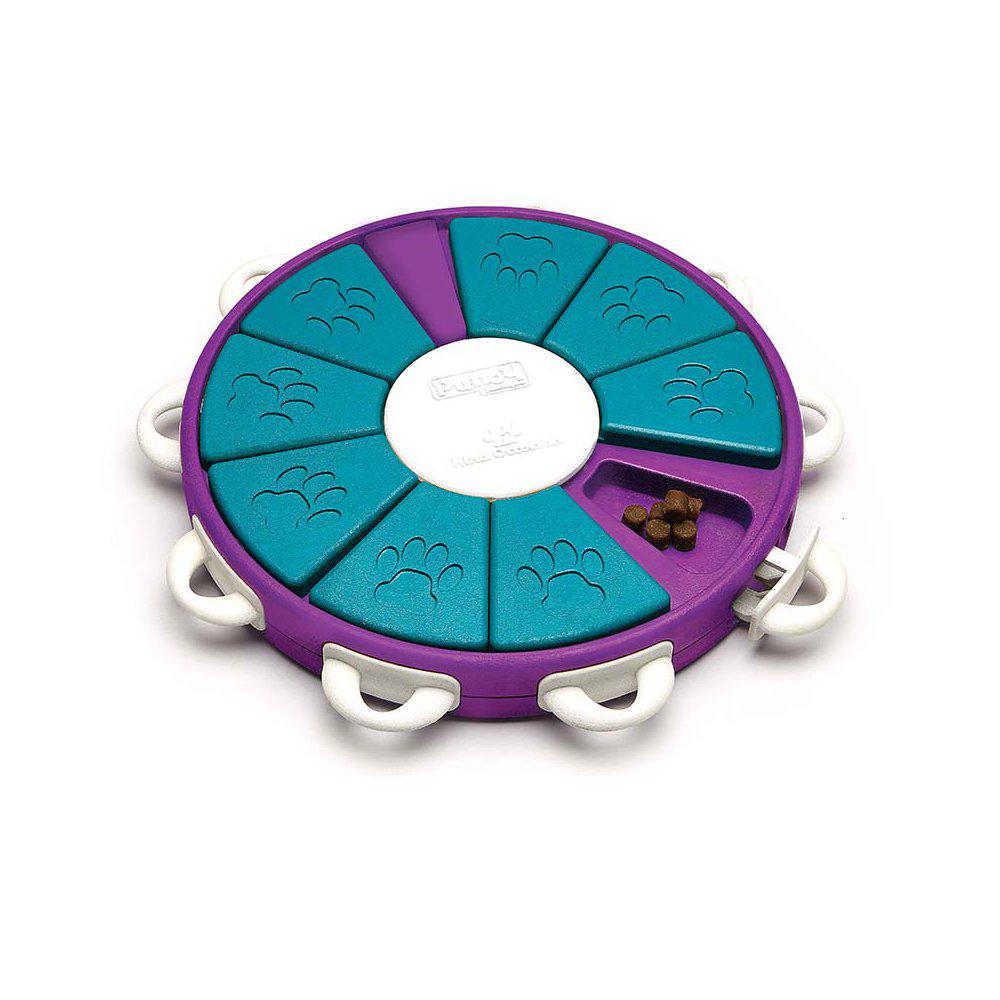 Dra ut handtagen så att brickorna på ovansidan kan flyttas runt. Lägg i mat eller godis i alla fack. Lås brickorna genom att skjuta in handtagen. Hundar är smartare än man tror, man behöver bara lära dem hur de ska göra!