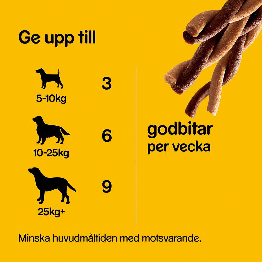 | Utfodringsanvisningar | Små hundar (5-9 kg), ge upp till 4 tuggstänger per vecka. Mellanstora hundar (10-24 kg), ge upp till 7 tuggstänger per vecka. Stora hundar (25 kg eller mer), ge upp till 14 tuggstänger per vecka. Minska huvudmåltiden med motsvarande. Detta är en godbit som är lämplig för hundar bara från 5 kg och mer. Olämplig för valpar under 4 mån. Förvaras svalt och torrt. En skål med friskt vatten ska alltid finnas tillgänglig. |