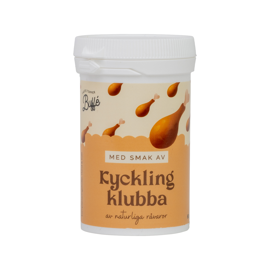 Svenska DjurApotekets Buffé Kycklingklubba är en smakförhöjare till den matkräsna hunden eller katten. Strö över fodret eller blanda med vatten för en buljongkänsla. Vill du att din hund eller katt ska dricka mer vatten kan du addera Buffé Toppers för en smakrik vattenskål!