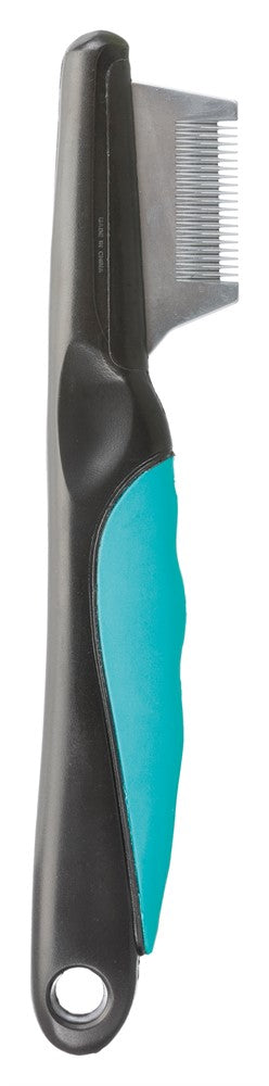 Lågstatiskt blad och handtag i anti-glid. Den fina är till för trimning av huvud och öron medan den grova är till för trimning av rygg och mage.